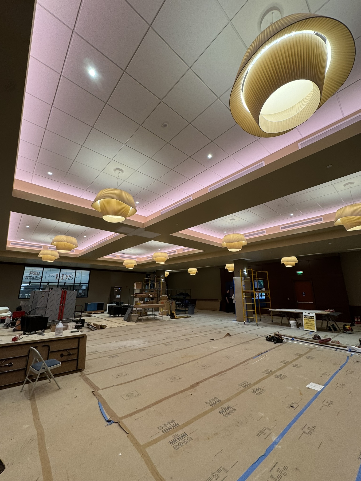 The work included a major expansion of the dining area, featuring a new stage, dedicated A/V room, and an extension into the existing lobby to support flexible programming and gatherings.